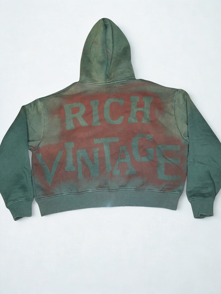 Expertly crafted with a vintage, weathered look, this zip up hoodie boasts quality chenille patch detailing and a premium comfortable fit. The back features intricate design elements that add a unique touch. Stay stylish and cozy in this one-of-a-kind sweatshirt.